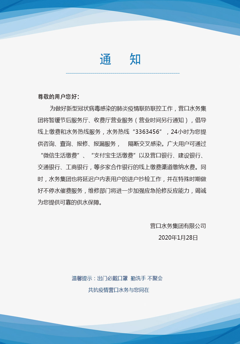 營(yíng)口水務(wù)集團(tuán)關(guān)于暫緩節(jié)后服務(wù)廳、收費(fèi)廳營(yíng)業(yè)服務(wù)的通知